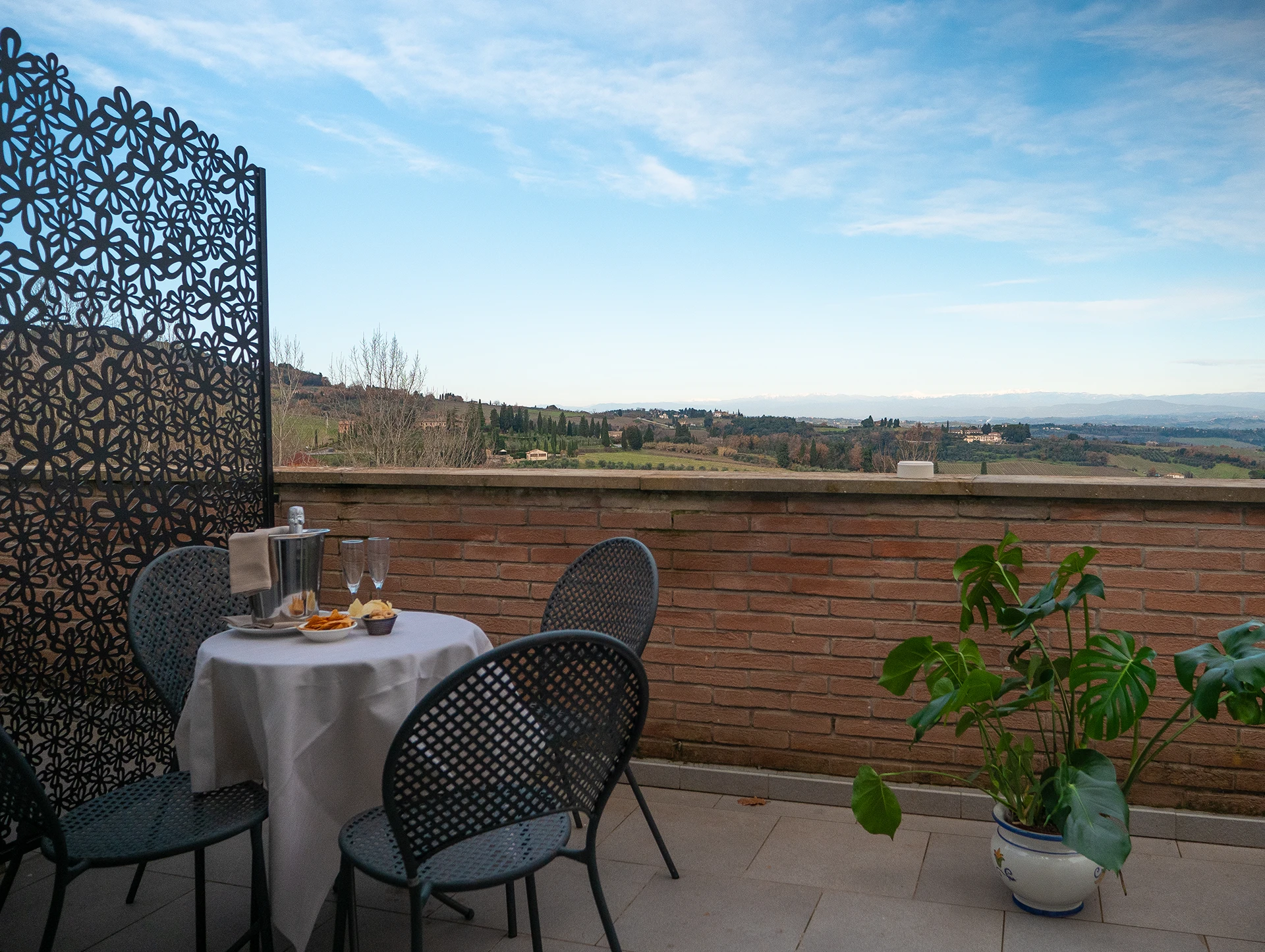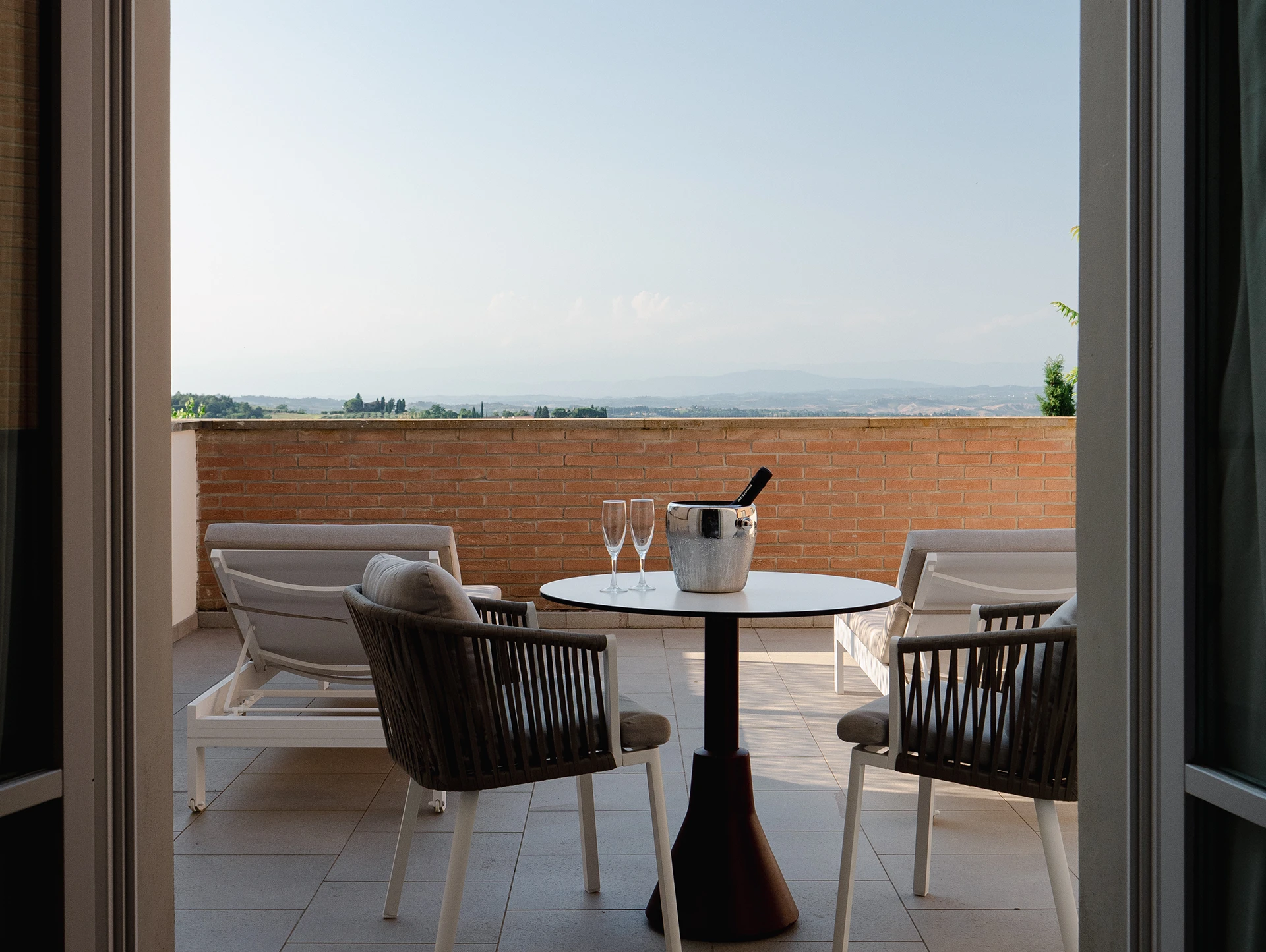 It is surrounded by a large terrace with panoramic views of the Tuscan hills.